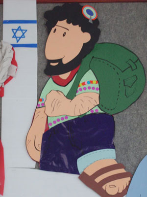 La nave Exodus è diventata emblema di ogni Alya, del ritorno di ogni ebreo dall’esilio nella terra dei padri. In questa “vignettistica” raffigurazione realizzata in grandi dimensioni per una yeshiva, ritroviamo a bordo della leggendaria nave Exodus tutti i tipi d’ebrei che oggi popolano la Terra d’Israele: vediamo l’ebreo ultraortodosso insieme all’itellettuale laico, il sionista religioso con la moglie medio-borghese accanto al kibbutzinikì e all’ebreo sefardita.